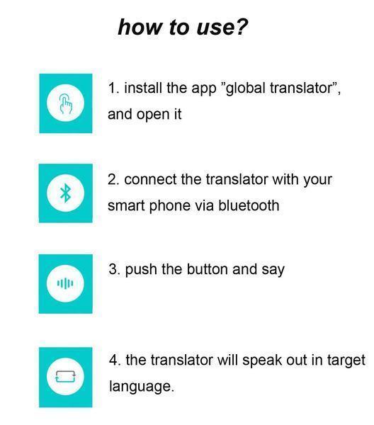 Connect the device to your Smartphone via Bluetooth and choose the two source and target languages on the APP Global Translator. Push the button on the device and hold it till you finished your speech; it will recognize what you said and speak out loud the simultaneous translation result on your Smartphone.